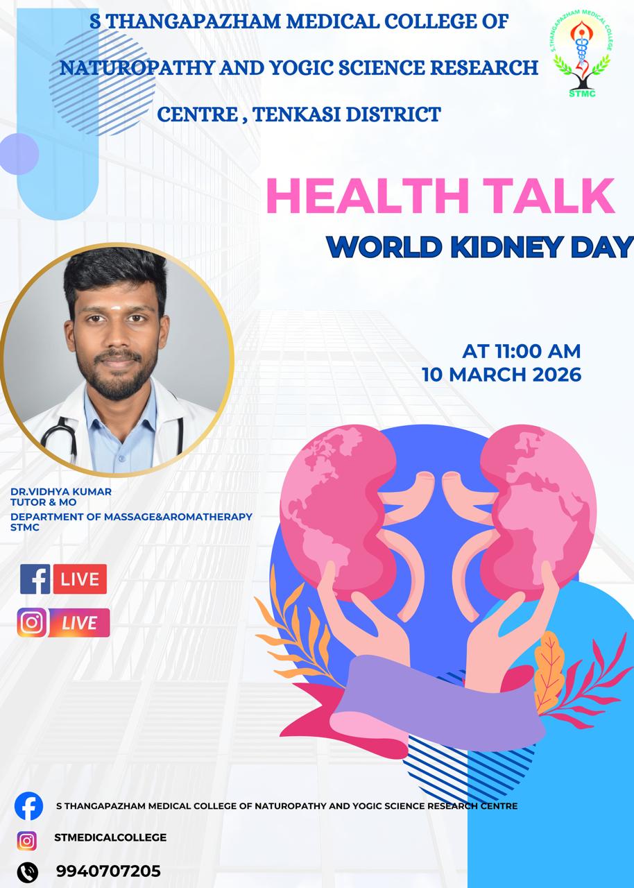 S Thangapazham Medical College of Naturopathy and Yogic Science Research Centre, Tenkasi District, is organizing a special Health Talk in observance of World Kidney Day on 10 March 2026 at 11:00 AM. The session will be delivered by Dr. Vidhya Kumar, Tutor & Medical Officer from the Department of Massage and Aromatherapy. This program aims to create awareness about kidney health, prevention of kidney-related diseases, and the importance of maintaining a healthy lifestyle through naturopathy and holistic practices. The event will be streamed live through the institution’s official Facebook and Instagram platforms to reach a wider audience